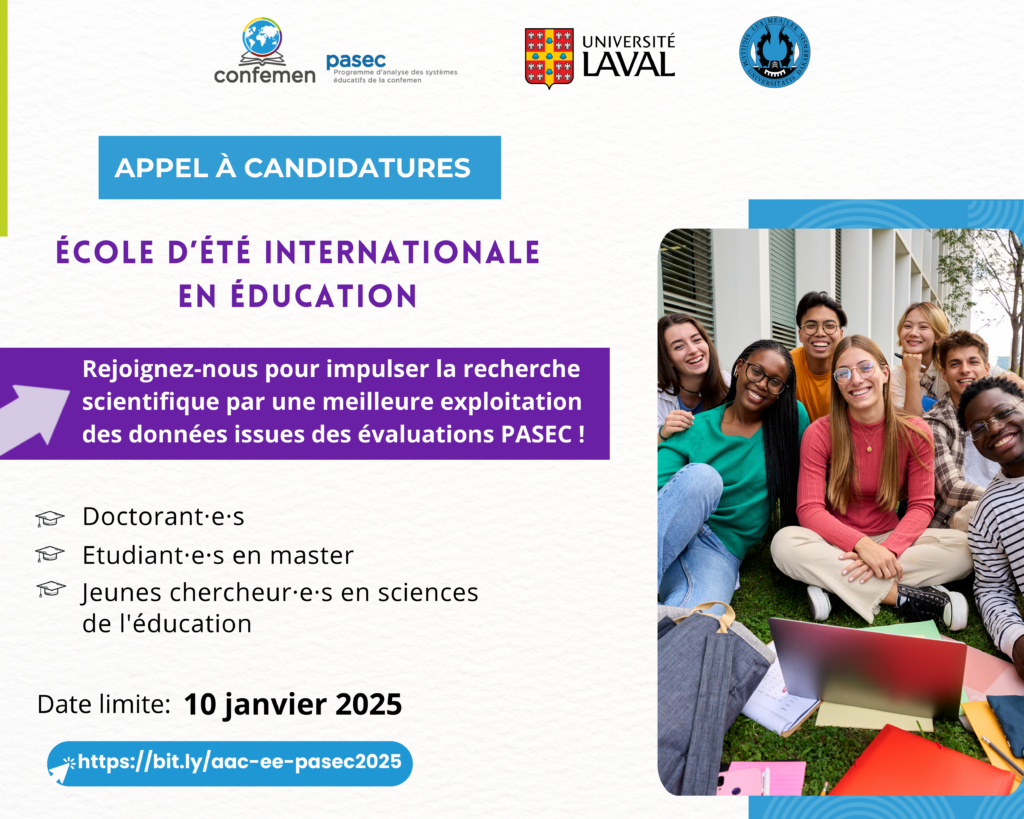 Le Programme d’analyse des systèmes éducatifs de la CONFEMEN (PASEC), en collaboration avec l’Université Cheikh Anta Diop de Dakar et l’Université Laval, organise du 24 août au 6 septembre 2025 à Dakar, au Sénégal, une école d’été internationale en éducation. Cette formation intensive et collaborative s’adresse aux étudiants en master et doctorat ainsi qu’aux jeunes chercheurs souhaitant approfondir leurs compétences en analyse de données éducatives comparatives.