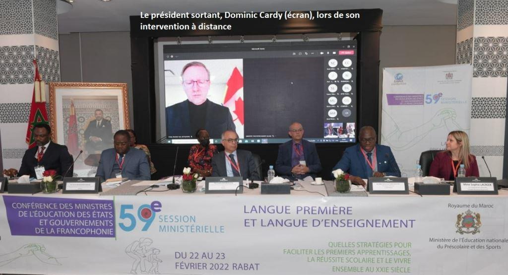 Pour le président sortant, le ministre Dominic Cardy, ce fut un grand honneur pour le Canada Nouveau-Brunswick d’accueillir en mai 2018, la 58e session ministérielle à l’issue de laquelle il leur a été confié la présidence de la CONFEMEN. Il a poursuivi en disant qu’après 45 mois de présidence, il était temps de remettre le témoin à son collègue du Maroc, tout en lui souhaitant plein succès et en l’assurant de son entière disponibilité en tant que prochain vice-président ainsi que celle de l’ensemble des ministres. Le président sortant a également formulé des vœux à l’endroit de son successeur pour que son mandat se déroule dans un meilleur contexte sanitaire et sécuritaire et que l’appui de la CONFEMEN aux politiques éducatives soit encore plus efficace et plus visible.